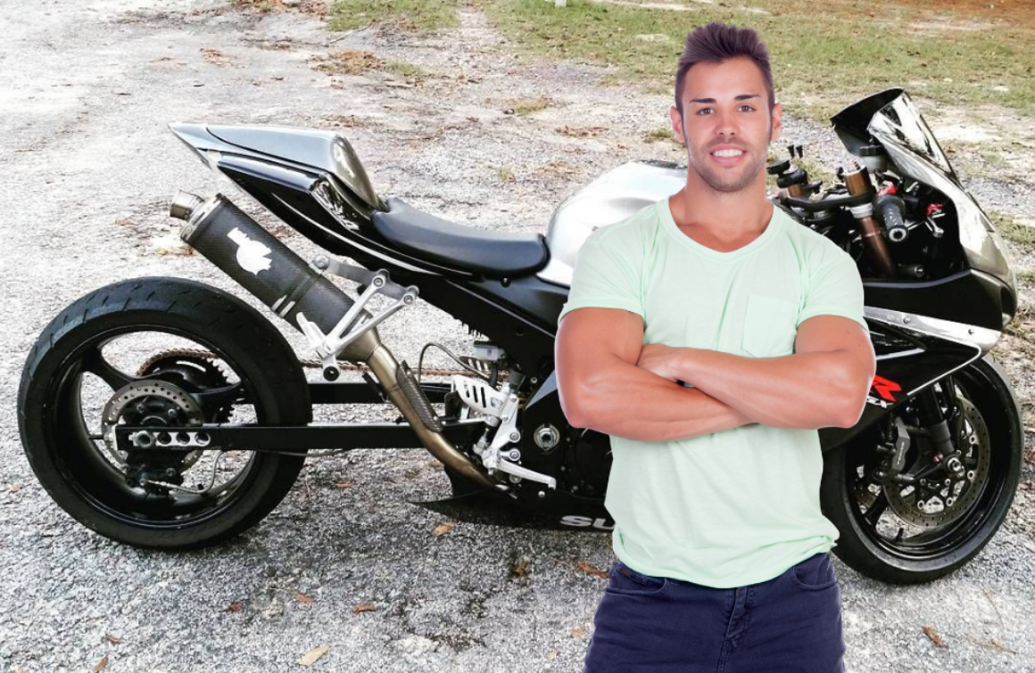 ATLANTA -- With his arms crossed, local young man Tyler Williams stands beside his 2005 GSX-R 1000 with damaged, mismatched fairings.